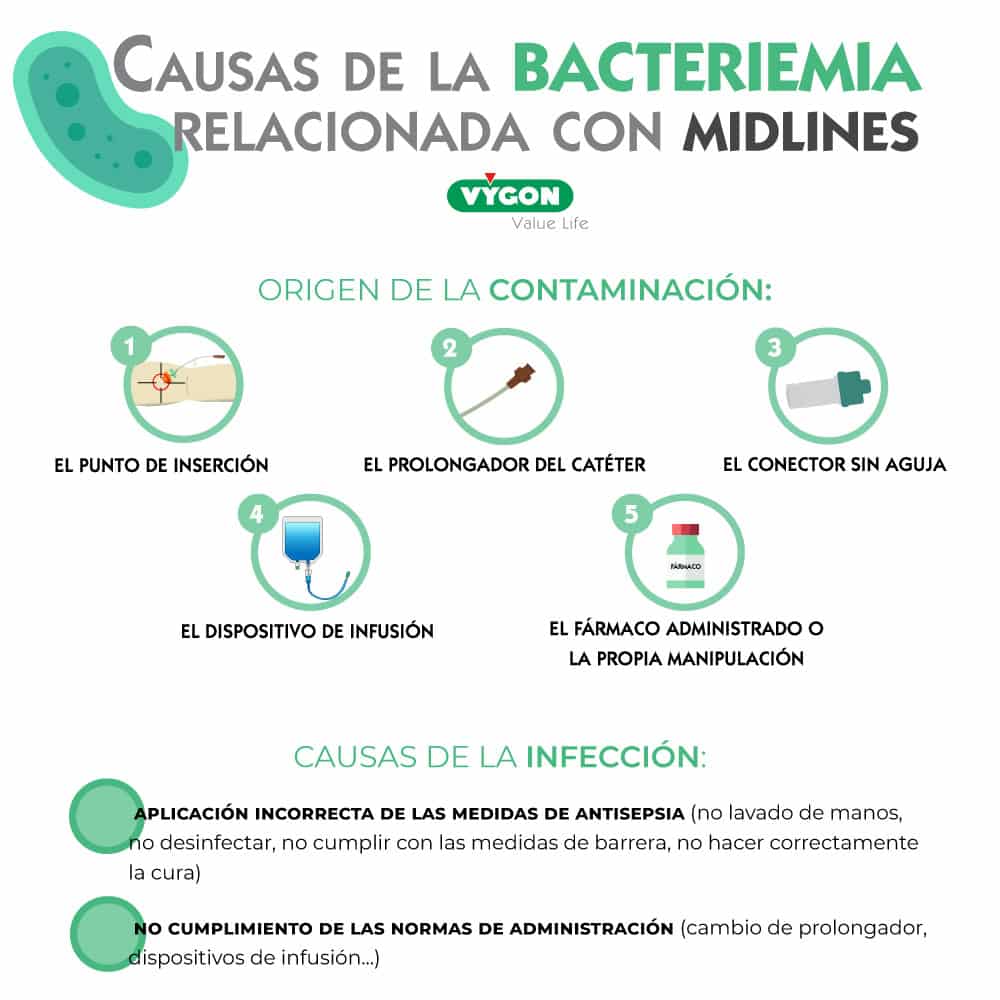 La infección puede ser causada por una aplicación incorrecta de las medidas de antisepsia (no lavado de manos, no desinfectar, no cumplir con las medidas de barrera, no hacer correctamente la cura) o no cumplir con las normas de administración (desinfección de conector sin aguja, cambio de prolongador, dispositivos de infusión…)