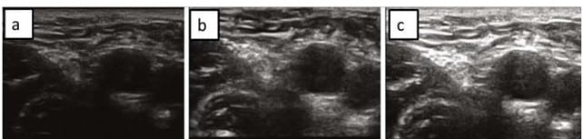 - Ganancia muy alta: La imagen es demasiado ecogénica apreciándose con dificultad y con artefactos el interior de los vasos. Además, los tejidos superficiales resultan demasiado “brillantes” dificultándose la visualización del paso de la aguja.