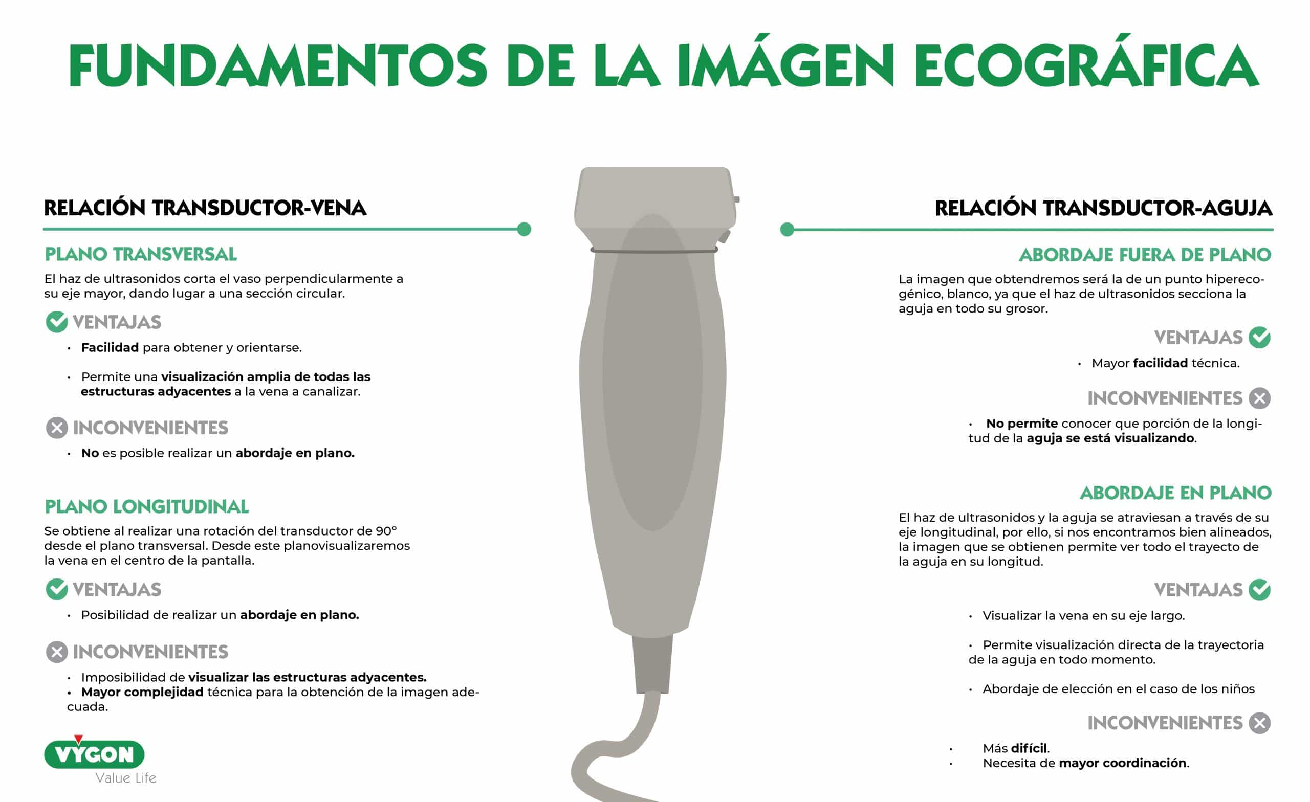 La relación transductor-aguja determinará la posición de la aguja respecto al transductor, y, por tanto, el tipo de imagen que obtendremos de la aguja.