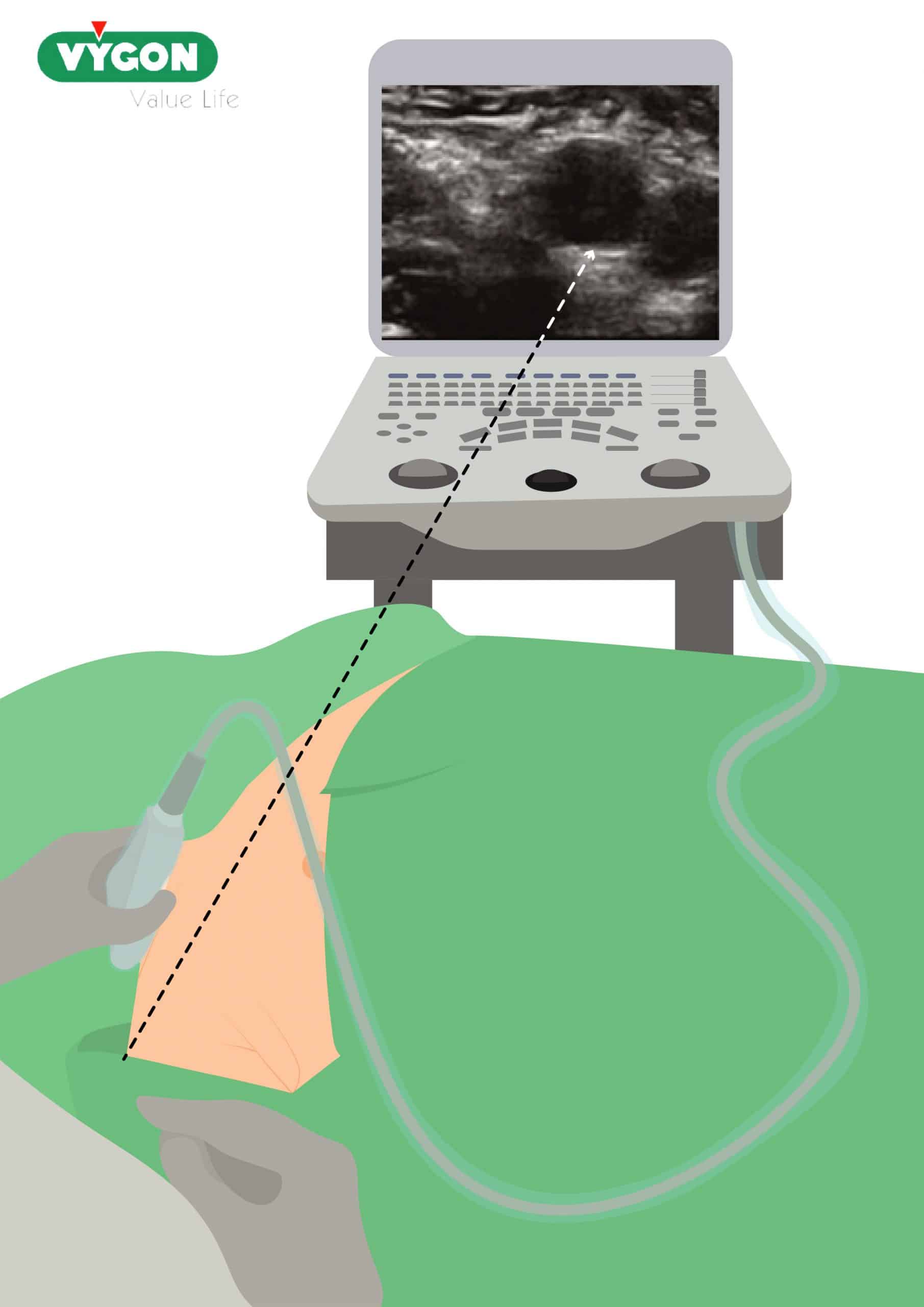 Para ello, se recomienda que la posición quede alineada en el mismo eje del transductor, pantalla del ecógrafo y nuestra visión. De este modo, al levantar la mirada y sin necesidad de girar el cuello, será posible apreciar la imagen y maniobrar con la aguja.