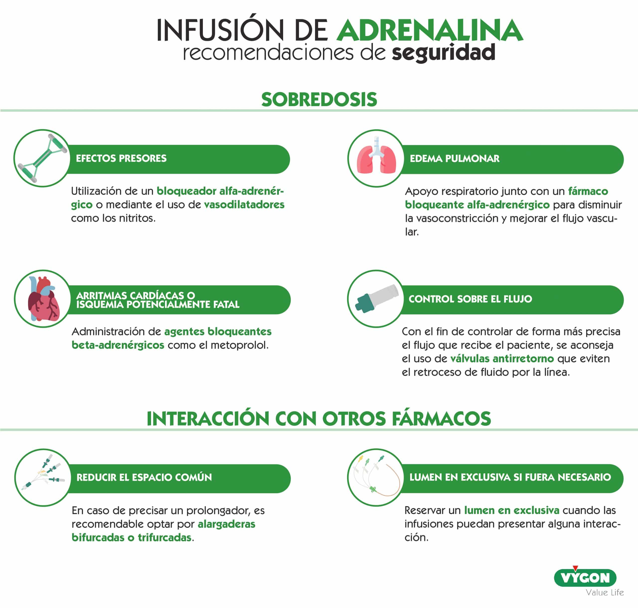 A la hora de infundir cualquier fármaco, hay que ser muy exacto en la dosis administrada. En el caso de la adrenalina, un exceso de infusión conduce a niveles supraterapéuticos que pueden causar efectos adversos en los que puede estar justificado un tratamiento de apoyo. [2]