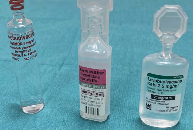 - Fármacos utilizados. Habitualmente se usan de 10-30 ml de anestésico local. Para procedimientos de corta duración y con escaso dolor postoperatorio podemos utilizar Mepivacaína 1.5% o Lidocaína 2%. Para procedimientos más largos podemos utilizar Levobupivacaína o Ropivacaína 0.5%. Para uso a través de catéteres para analgesia (Silverstim o Multiplex) podremos utilizar anestésico local a más baja concentración (Ropivacaína 0.2% o Levobupivacaína 125%) a unas dosis de 3-4 ml por hora y bolos de 2-3 ml con un tiempo de cierre de 30 minutos.