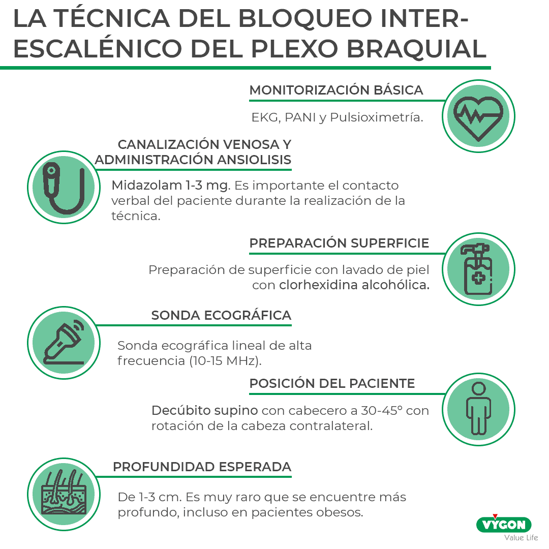 Tal y como explican los doctores López y Ortigosa en la Revista Arydol[1], el abordaje interescalénico del plexo braquial es la técnica más proximal de anestesia del plexo braquial. Está principalmente indicado para la cirugía de hombro y de la parte proximal de la extremidad superior. Para cirugías en territorios por debajo del codo, será más eficaz realizar bloqueos a niveles más dístales del plexo braquial, ya que siguiendo este abordaje resulta difícil bloquear las raíces de C8-T1.