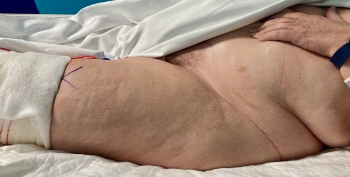 - Posición del paciente: decúbito supino. Puede ser necesario colocar una pequeña elevación debajo del glúteo ipsilateral para elevar más la zona del pliegue inguinal. En pacientes con sobrepeso importante puede ser necesario sujetar el exceso de grasa abdominal para facilitar la realización de la técnica.