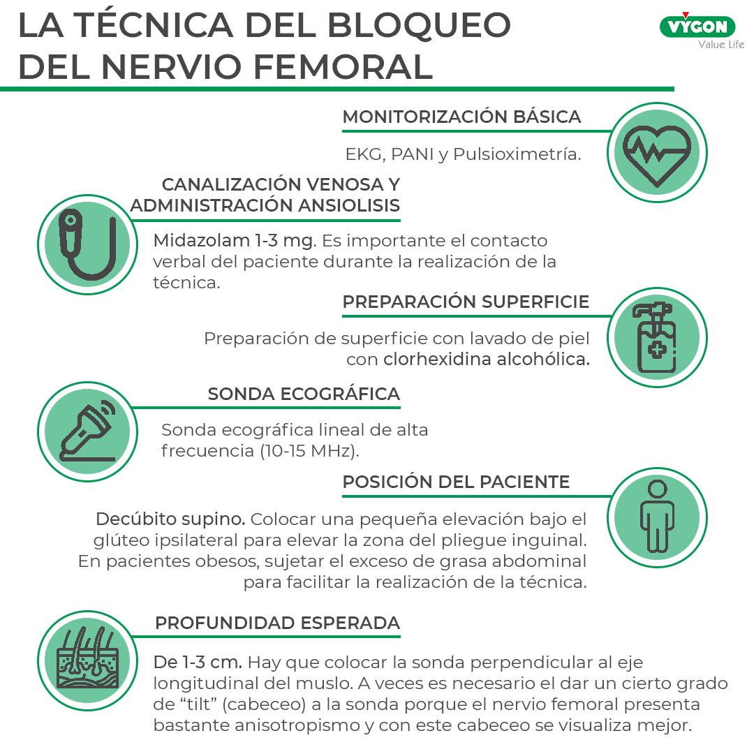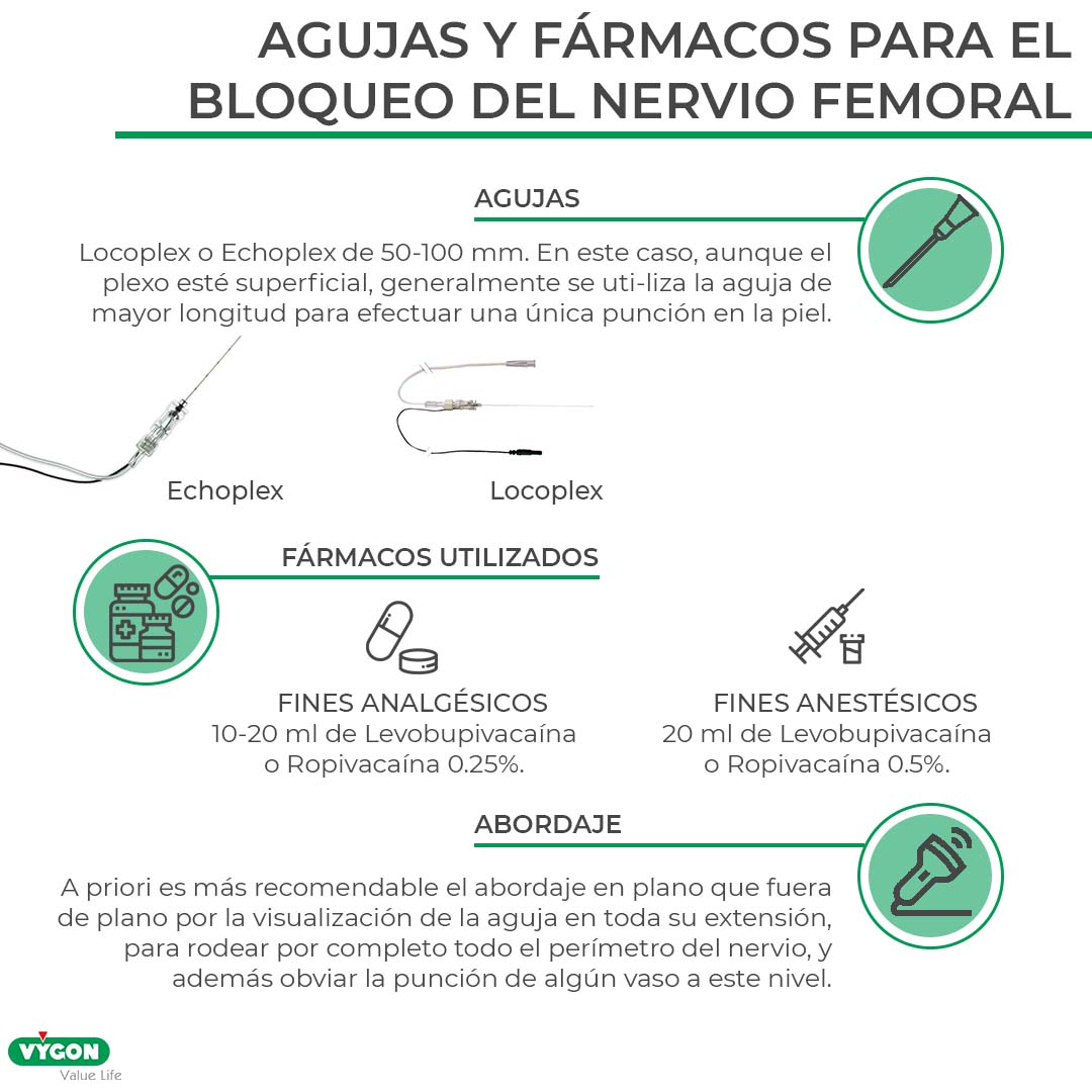 El bloqueo del nervio femoral se realiza para proporcionar analgesia fundamentalmente al muslo y a la rodilla. La identificación del paquete vascular femoral es clave para la localización del nervio femoral. A nivel inguinal la vena y la arteria femorales pasan por debajo del ligamento inguinal junto al nervio femoral en una disposición de medial a lateral por debajo de la fascia ilíaca y la fascia lata. A nivel del pliegue inguinal se encuentra situado por encima del músculo ilíaco.