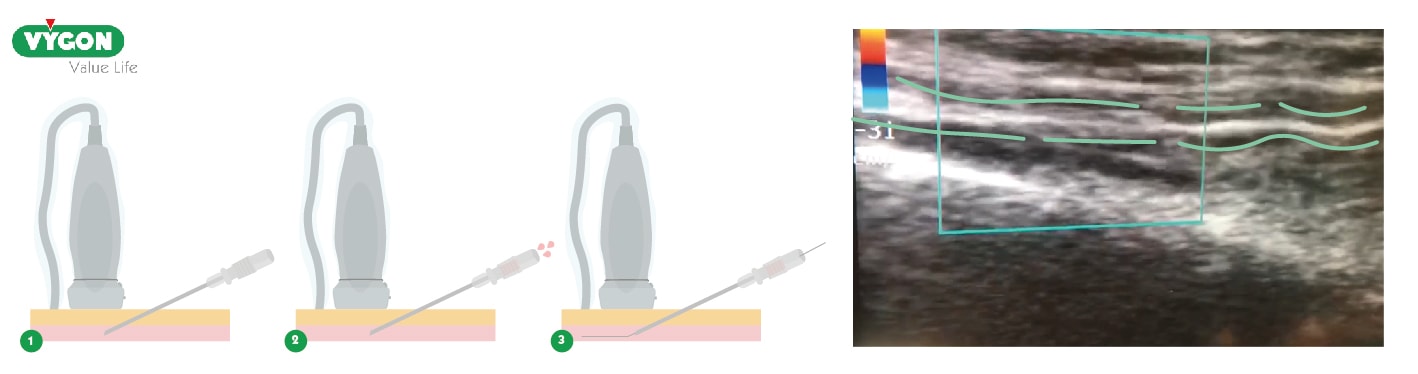 En caso de encontrar alguna resistencia al paso de la guía, podemos retirarla unos milímetros e intentar volver a introducirla rotándola ligeramente para facilitar su entrada, así como rotar la aguja para intentar encontrar un mejor ángulo de entrada al vaso teniendo en cuenta la dirección del bisel.