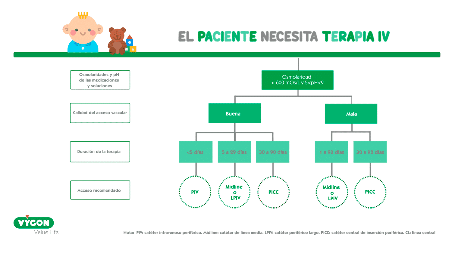 Las guías de buena práctica clínica recomiendan el uso de los catéteres de línea media en aquellos niños que requieran tratamientos intravenosos de más de 5 días de duración, siempre que sean fármacos o fluidos compatibles con la administración por vía venosa periférica.