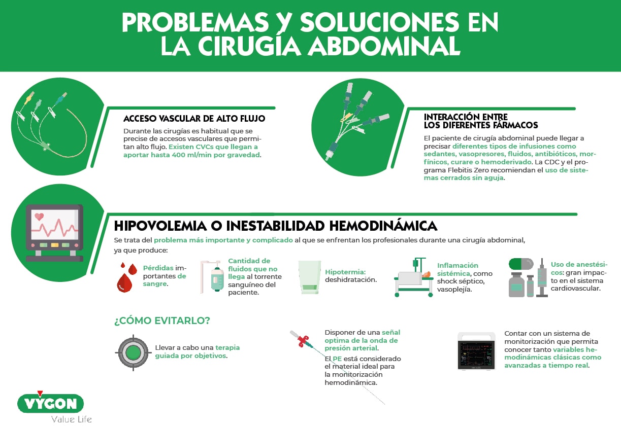 La cirugía abdominal mayor está considerada de alto riesgo, por lo que el profesional además de contar con un acceso vascular de alto flujo y dispositivos que permitan la infusión múltiple reduciendo al máximo la interacción entre las diferentes sustancias; también deberá tener en cuenta otra serie de precauciones que resultarán en un mejor pronostico: