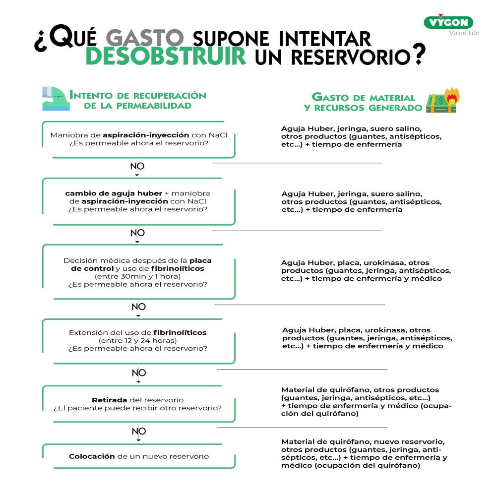 Las oclusiones de reservorios se pueden solucionar, aunque no en todos los casos, con urokinasa. El uso de esta solución fibrinolítica está protocolizado en muchos centros y se llega a inyectar incluso varias veces en la vida de un mismo reservorio para poder recuperar su permeabilidad(4).