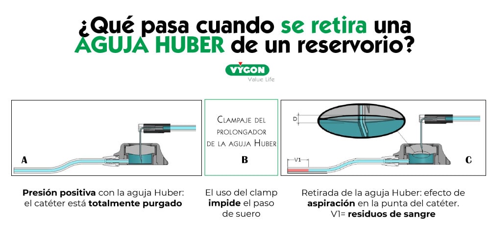 Existe también un fenómeno de aspiración cuando se retira una aguja Huber: cuando se extrae la aguja, arrastra el septum del reservorio lo cual provoca una aspiración importante y el retroceso de sangre en el catéter del reservorio. Cuando está totalmente retirada, el septum vuelve a su posición, pero persiste un residuo de sangre en la punta del catéter.