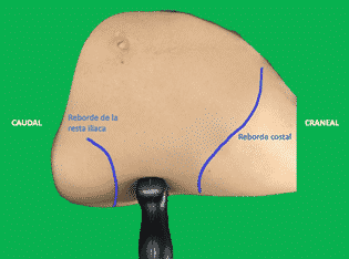 Figura. Colocación de la sonda lineal entre el reborde de la cresta iliaca y el reborde costa en la línea medio axilar.