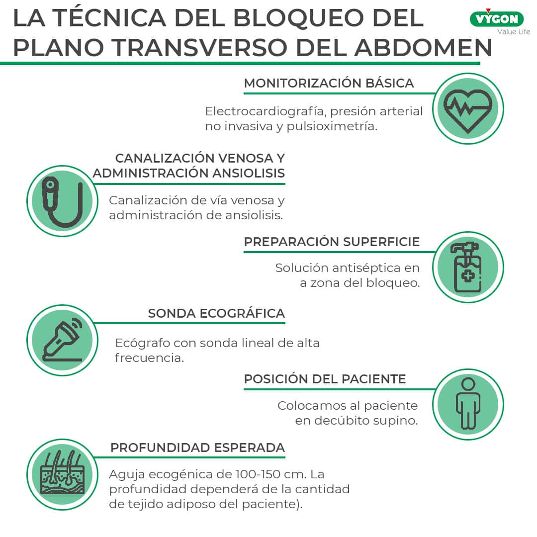 Primero, colocamos al paciente en decúbito supino o decúbito lateral. Tras las medidas de asepsia, se posiciona la sonda líneal de nuestro ecógrafo perpendicular a  la línea media axilar, entre la cresta ilíaca y el reborde costal, donde identificaremos los músculos oblicuo externo, oblicuo interno, transverso abdominal y peritoneo. Posteriormente, introduciremos la aguja en plano, desde medial hacia lateral, buscando colocar la punta de la misma en la fascia ubicada entre el músculo oblicuo interno y el músculo transverso del abdomen. Localizada dicha fascia realizaremos la inyección del anestésico local.