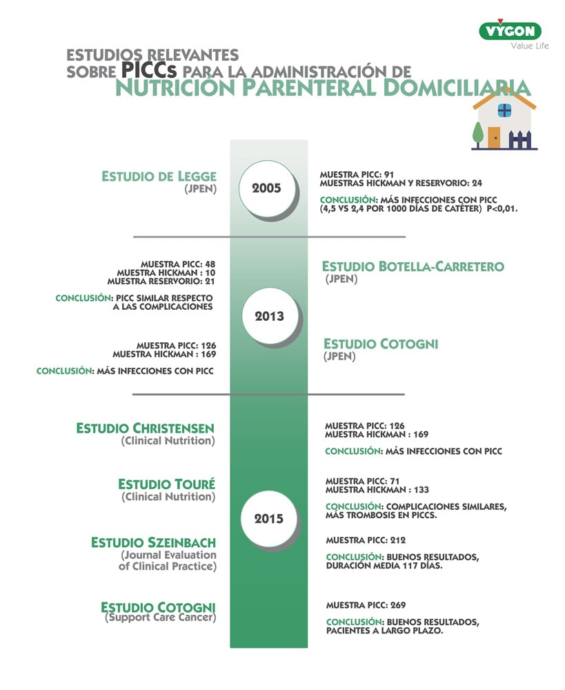 Su uso se remonta à más de 15 años en este ámbito. En el año 2013 y 2015 se publicaron 2 estudios, Botella-Carretero et.al y Cotogni et.al, que demuestran que el PICC se puede usar para la administración de NPD a largo plazo y con una baja tasa de complicaciones