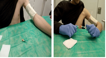 Foto SecurAcath y paciente manipulando su PICC: cortesía de Maite Parejo.