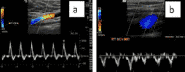 En el caso de existir dudas, el método más fiable para diferenciarlas seria la realización de un Doppler pulsado donde las venas se representan como una onda bifásica y a veces una retrograda de baja velocidad; mientras que la arteria presenta un flujo fundamentalmente sistólico de alta velocidad.