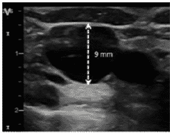 Para determinar el calibre se empleará el modo 2D y la función “regla”, “diámetro” o su equivalente según le modelo de ecógrafo. Una vez en este modo, el operador se dispondrá a colocar el cursor en la parte superior y medial de la pared de la vena; posteriormente trazará una línea recta hasta llegar al borde opuesto de la pared, obteniéndose, así, el diámetro antero- posterior.