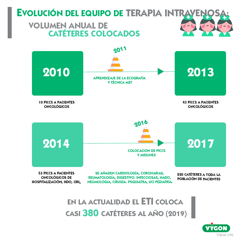 Actualmente, el equipo es un grupo formado y afianzado en acceso vascular, lo constituimos 10 personas en distinto nivel formativo. Estamos aleccionadas en ecografía aplicada al acceso vascular, técnica Seldinger y Seldinger modificada, comprobación de situación de punta por ECG, gestión y complicaciones de catéteres.