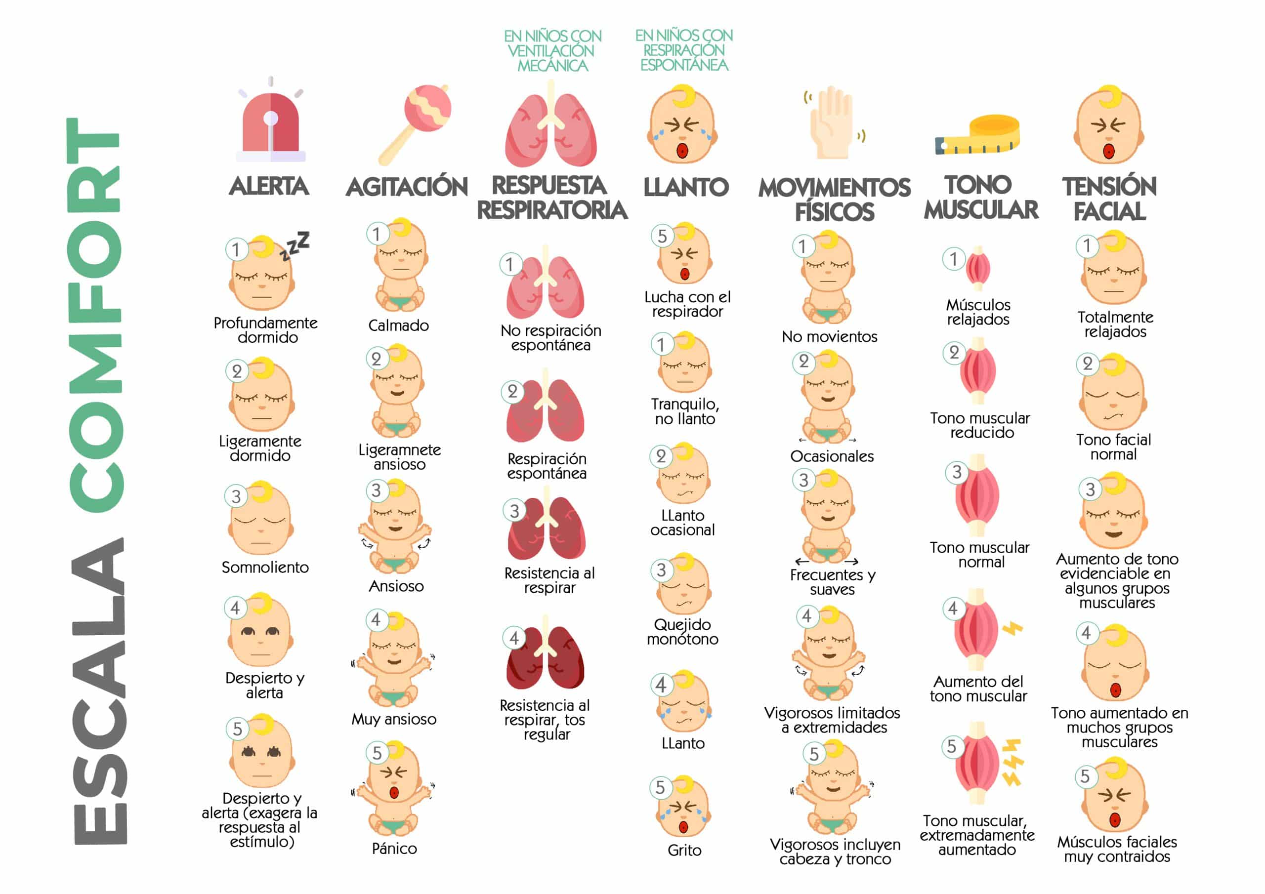 - Utilidad clínica: evalúa los signos conductuales y fisiológicos como la ventilación espontaneo u asistida, despierto o en estado de sedación. Tono muscular, movimientos corporales, expresión facial, frecuencia cardiaca y presión arterial. Es por ello por lo que al ser tan completa está validada para la UCIN.