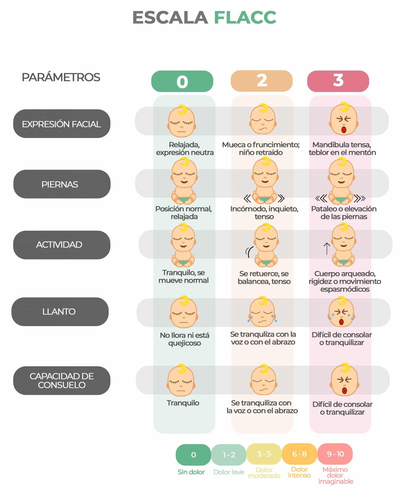 - Variables: evalúa 6 variables (expresión facial, llanto, patrón respiratorio, postura -se incluyen aquí movimientos de brazos y piernas- y excitación) asignando a cada una un valor entre 0 y2
