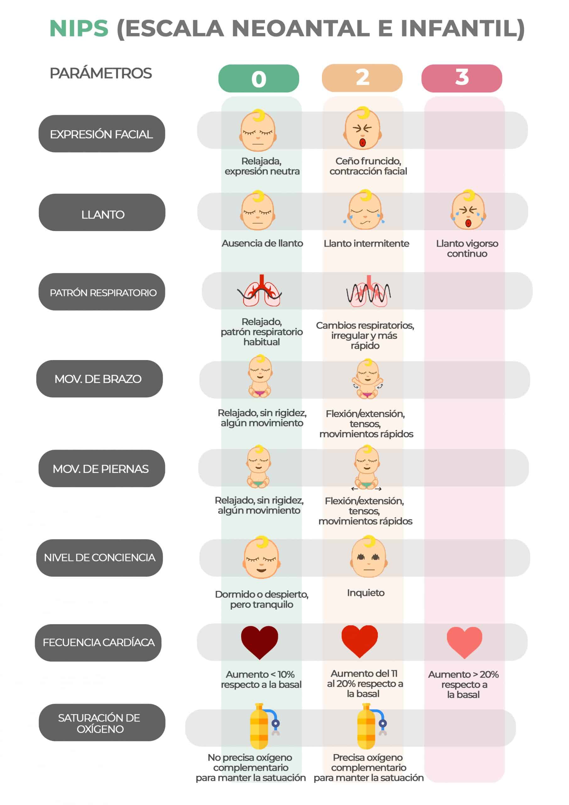 Para evaluar el dolor que presenta un niño en las unidades neonatales se emplean las llamadas escalas del dolor que proveen un score o puntuación, como descripción numérica o cuantitativa, basándose en una combinación de parámetros de las alteraciones anteriormente mencionadas. Estas escalas se usan en la práctica y en la investigación. Existen más de 40 -algunas diseñadas sólo para la investigación-. A continuación, enumeramos las escalas más usadas en Neonatología.