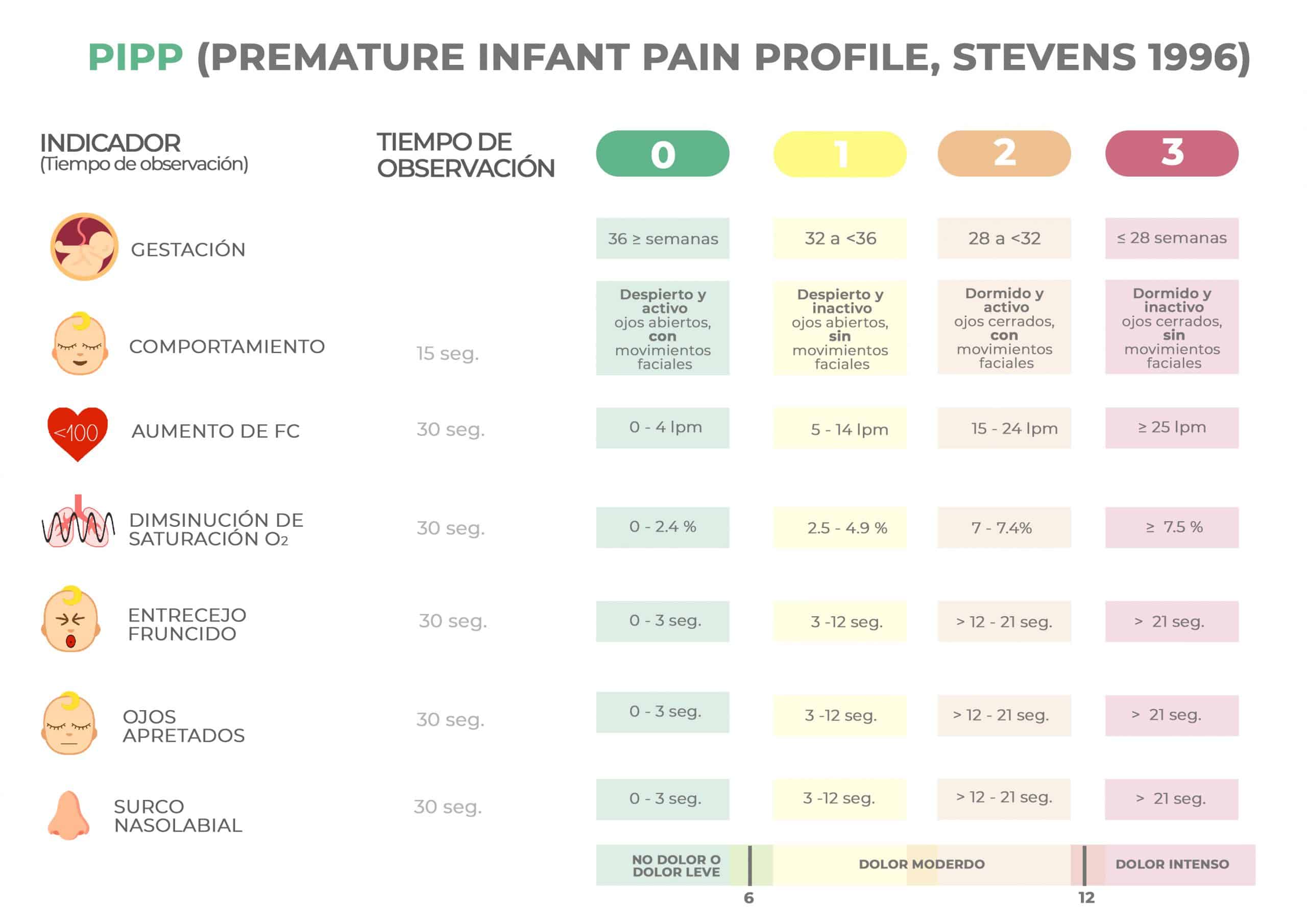 - Variables: Emplea 7 variables (cambios en la frecuencia cardíaca, en la saturación de oxígeno, acciones faciales y estado de neuro-comportamiento, ponderado para edad gestacional) puntuando de 0 a 3 cada una de ellas.