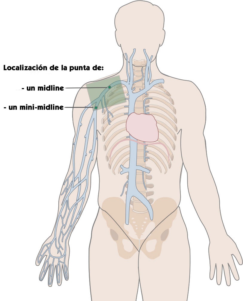 - El mini-midline: catéter de 8-10cm que se puede insertar en el antebrazo o el brazo cuya punta tiene una localización que no va más allá de la cavidad axilar;