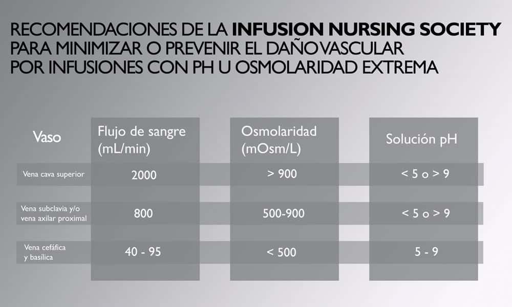 El manual GAVeCeLT sobre PICC y Midline indica que la infusión periférica debe hacerse únicamente con fármacos o soluciones cuyo pH esté entre 5 y 9, cuya osmolaridad esté por debajo de 750mOsm/L y que no sea vesicante incluyendo como excepción, las nutriciones parenterales de corta duración <800mOsm/L. También señala que la línea media que sea axilar o subclavia es considerado acceso venoso periférico.