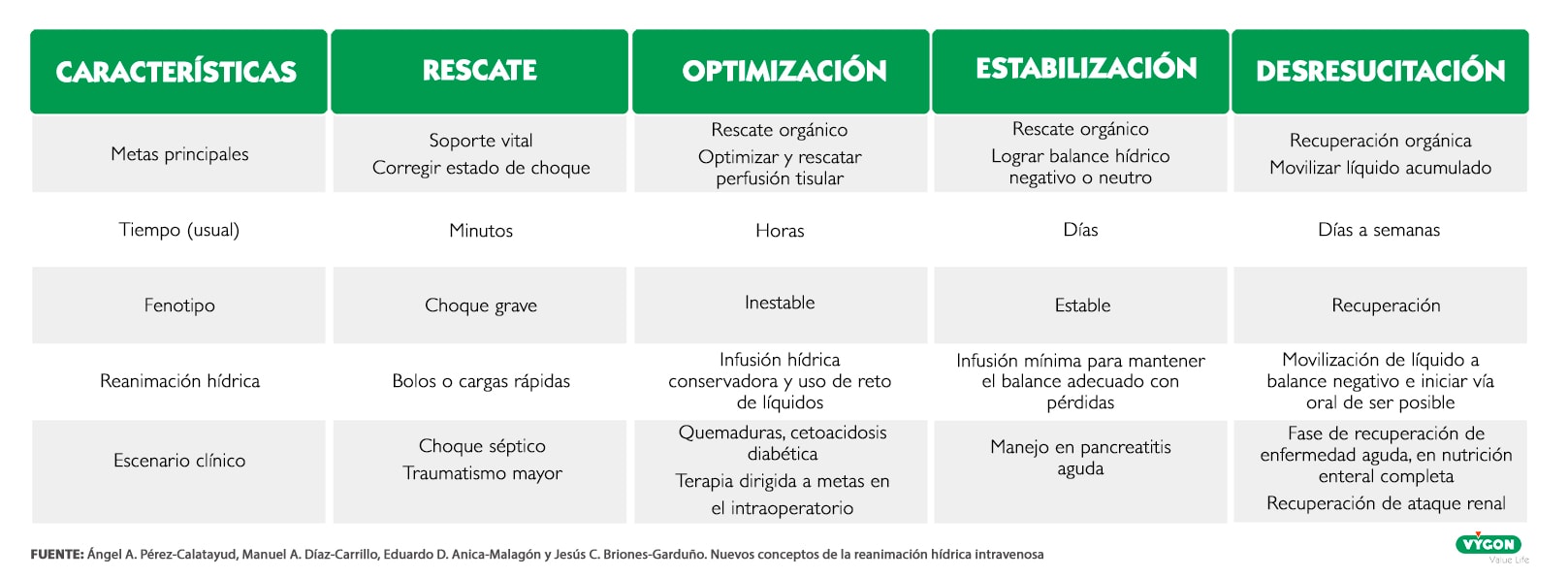 Esta fase abarca desde los primeros minutos de la terapia de fluidos hasta las 24 horas y se caracteriza por una estrategia de fluidos dirigida por objetivos basada en una rehidratación temprana para la estabilización de la hipoperfusión tisular.