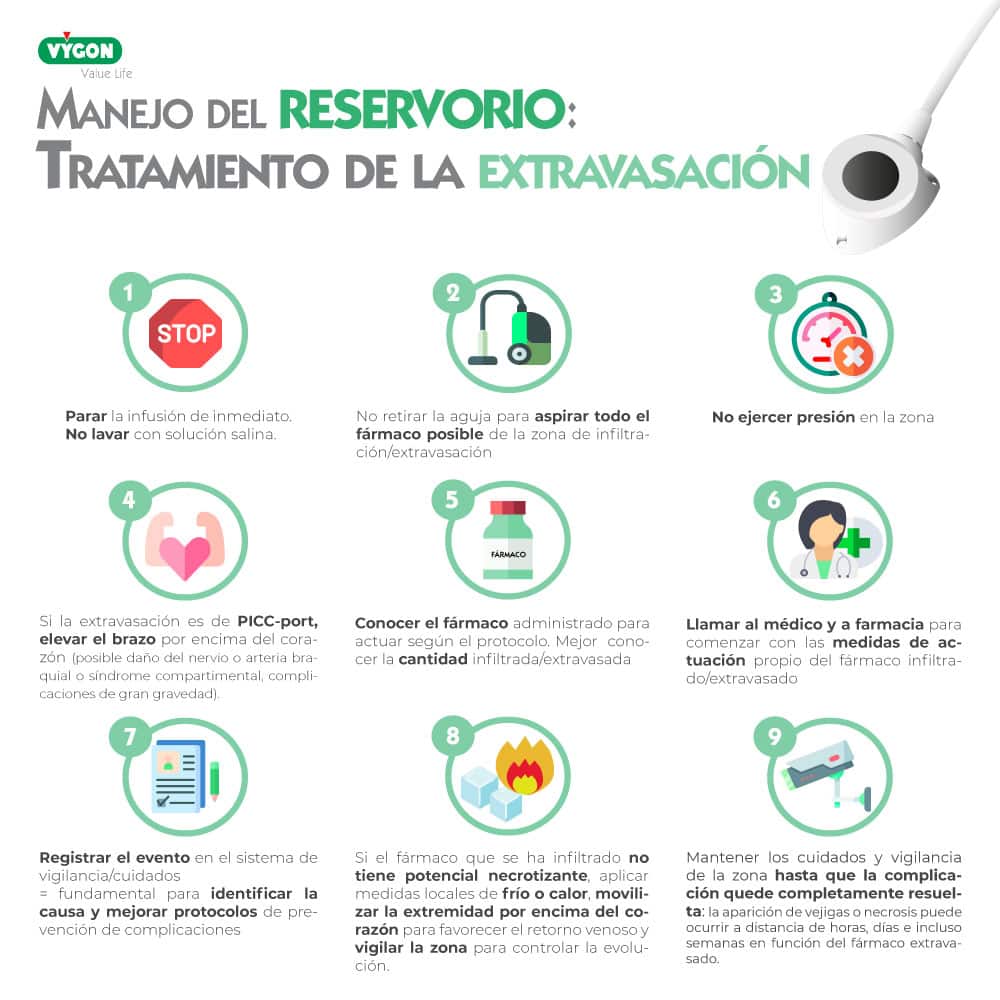 Se deben vigilar signos de rubor o palidez de la zona (las infiltraciones/extravasaciones profundas no causan cambio de color de la piel) , calor, dolor, presión, hinchazón, salida de líquido por el punto de punción, entumecimiento u hormigueo de la zona. El paciente o familiar deben estar al corriente sobre cómo proceder en caso de complicación en domicilio. Una buena recomendación es que vigilen la zona comparándola con la zona simétrica del cuerpo, es decir, el otro hemitórax (en caso de reservorio torácico) o el otro brazo (en caso de PICC-port)