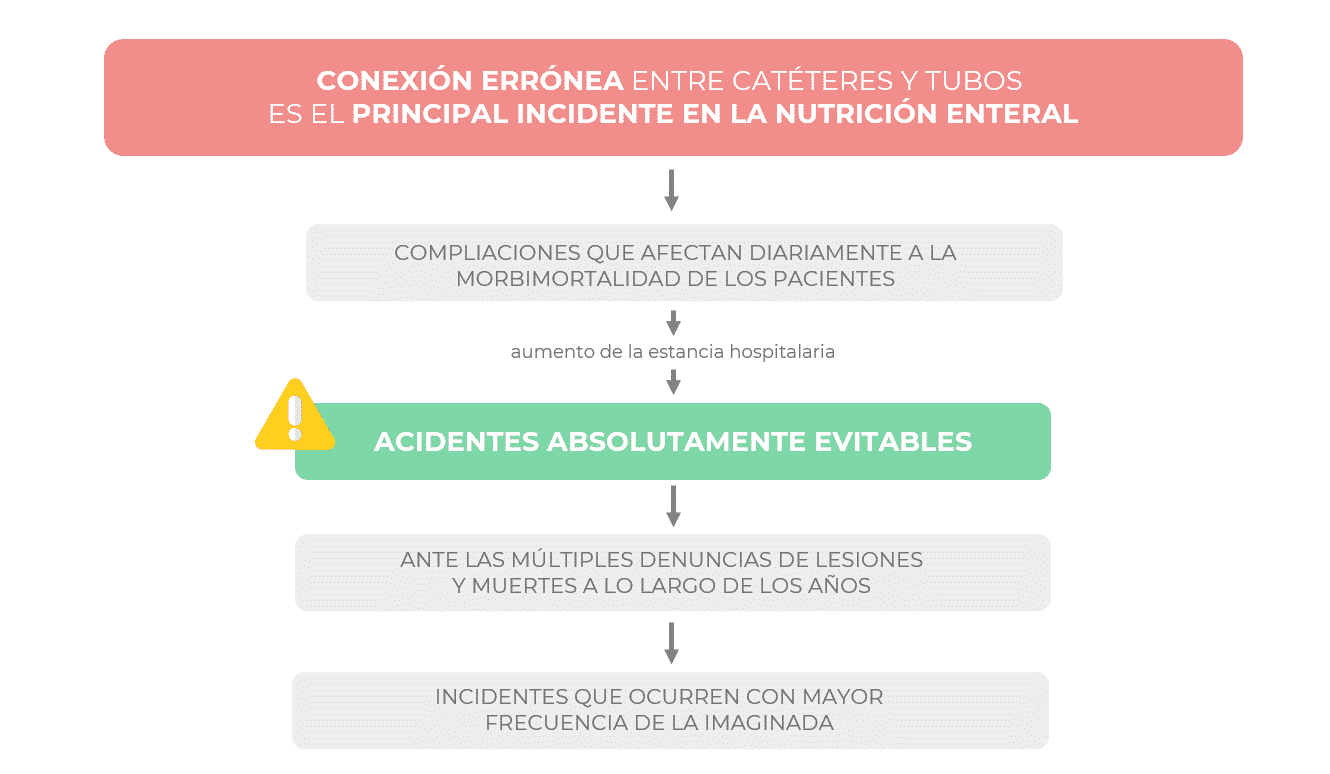 Los errores potencialmente fatales en la conexión de catéteres y tubos son los principales incidentes relacionados con la administración de nutrición enteral. Las complicaciones derivadas de estos pueden, incluso a llegar a causar la muerte del paciente. Estos errores pueden evitarse ya que existen dispositivos que evitan las conexiones erróneas. Sin embargo, en muchos países estos sistemas de seguridad siguen sin emplearse.
