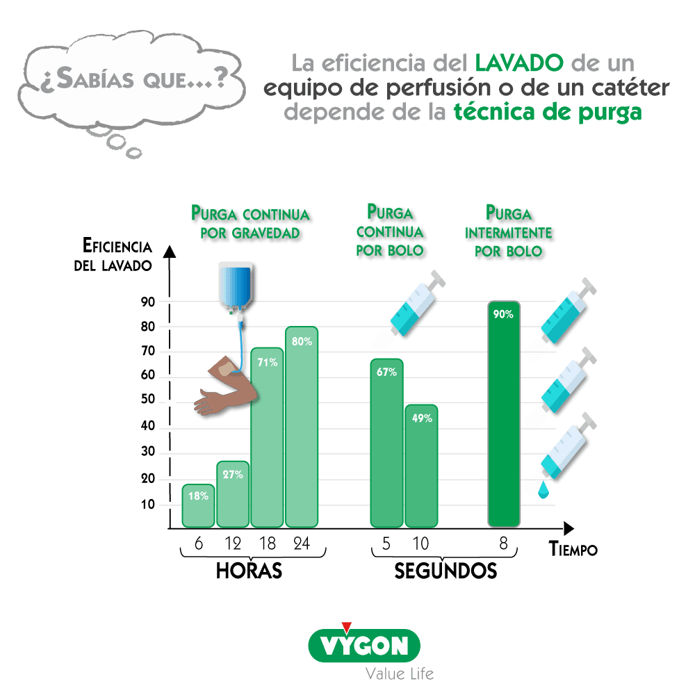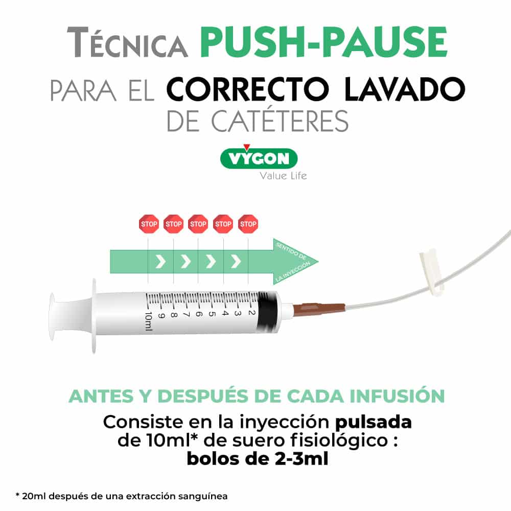 - hacer un correcto lavado con jeringa y técnica push-pause cuando se ha finalizado la infusión. En efecto, la gravedad no permite un lavado eficiente de la línea intravenosa: