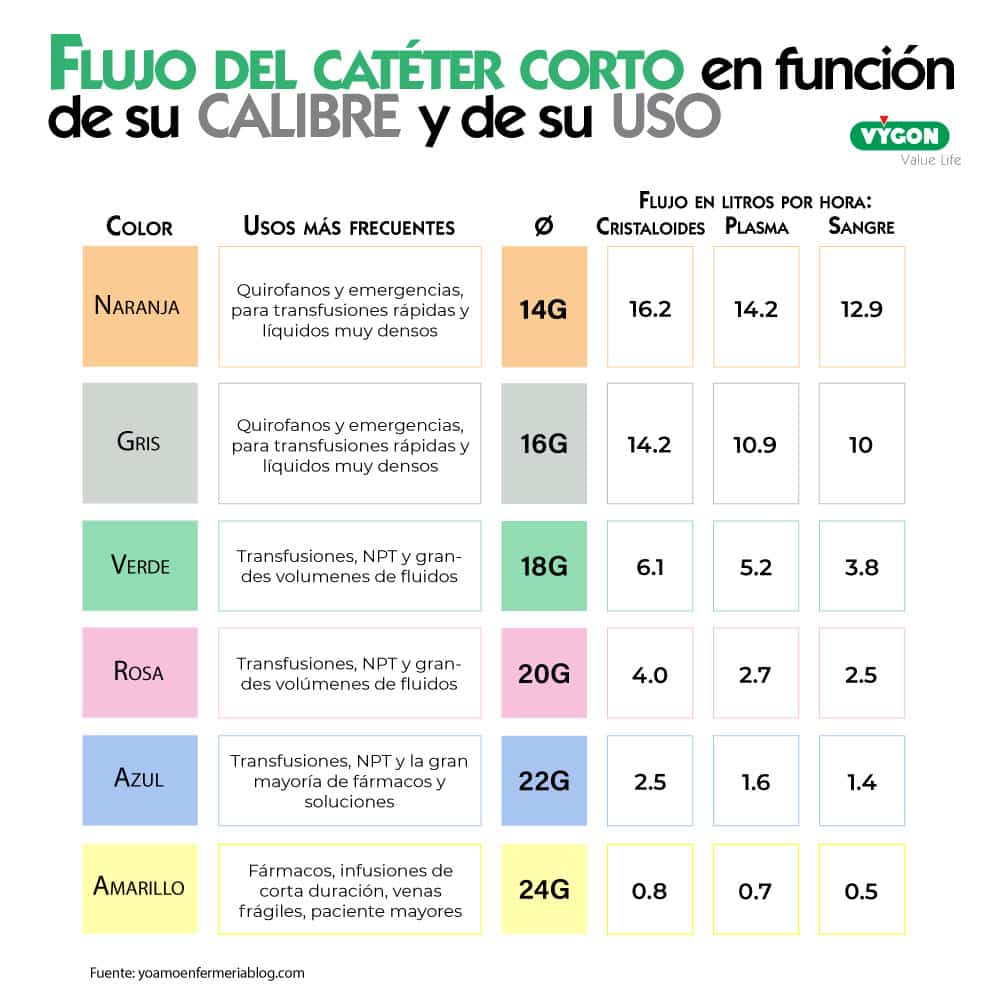 En adultos, los flujos por gravedad que se consiguen con los catéteres cortos en función de su calibre y de la viscosidad de las soluciones/fluidos infundidos, son los siguientes: