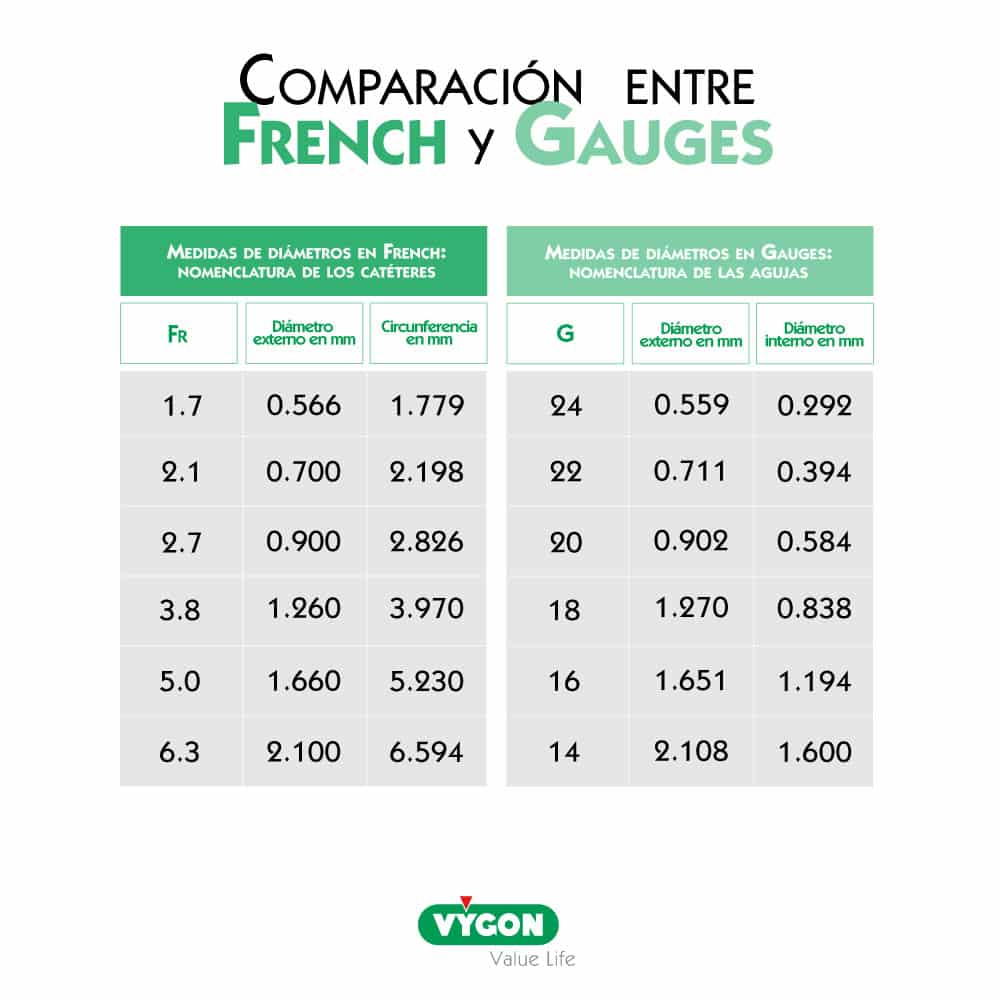 Los Gauges son las unidades de medida utilizadas para los catéteres cortos. En cuanto más pequeño el número, mayor es el diámetro del catéter.