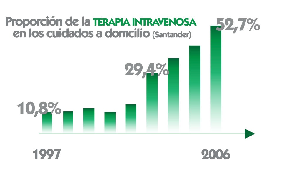 Sin embargo, a lo largo de los años, este tipo de administración ha crecido hasta ser un cuidado importante dentro del abanico asistencial que ofrece un servicio de HAD. A continuación el ejemplo del Hospital Universitario Marqués de Valdecilla y la evolución del porcentaje de pacientes ingresados en HAD para un tratamiento intravenoso (3):