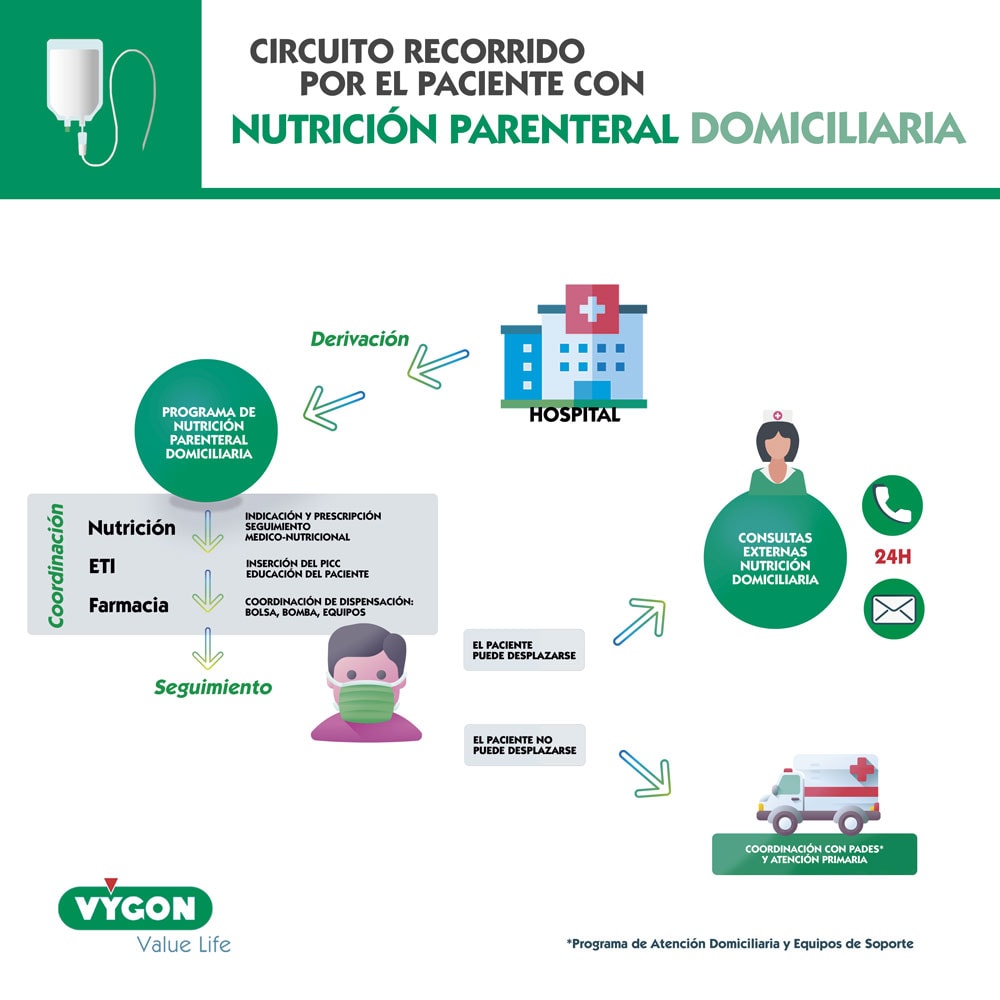 Como lo menciona el estudio de Lyn Howard y Christopher Ashley Management of Complications in Patients Receiving Home Parenteral Nutrition (1), muchos de los pacientes con Nutrición Parenteral al no necesitar cuidados/curas específicos, no precisan ser ingresados y son, entonces, candidatos a la nutrición parenteral domiciliaria:
