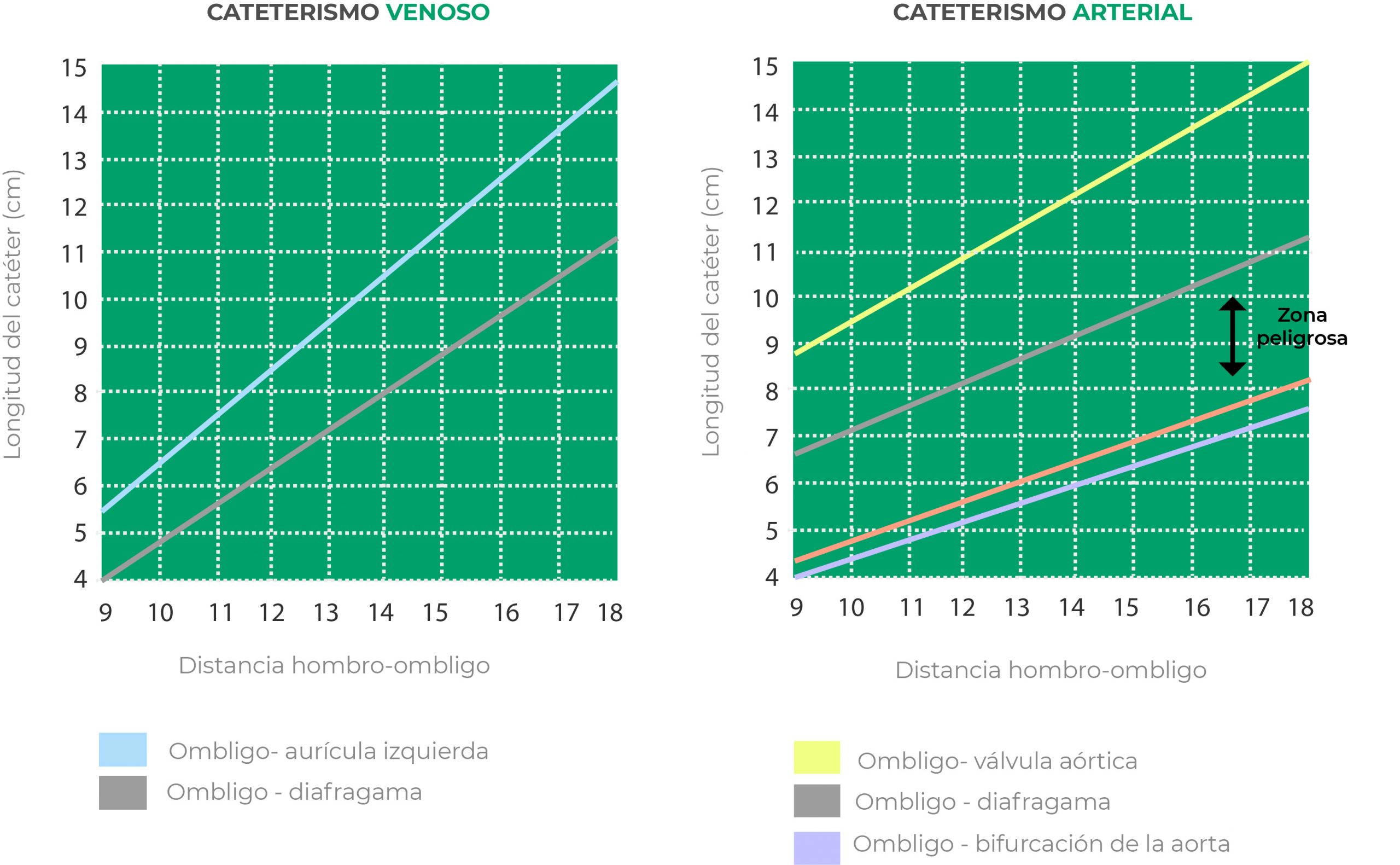 Existen varios métodos para calcular la longitud de inserción de los catéteres umbilicales. La técnica Dunn está basada en mediciones de los vasos umbilicales en necropsias de neonatos en las que se mide la longitud en línea recta del hombro al ombligo; y el método Shukla que utiliza fórmulas basadas en el peso al nacimiento1,3,4.
