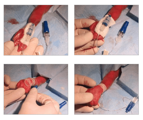 - Sujetar la cánula de acero tipo mariposa e introducir el catéter con ayuda de las pinzas. El catéter debe progresar lentamente (9,5 cm en cada paso) sin ofrecer resistencia. Durante la introducción, el ayudante puede favorecer el avance del catéter si hay dificultades para la progresión de este, movilizando o masajeando el miembro o incluso con pequeños lavados de suero