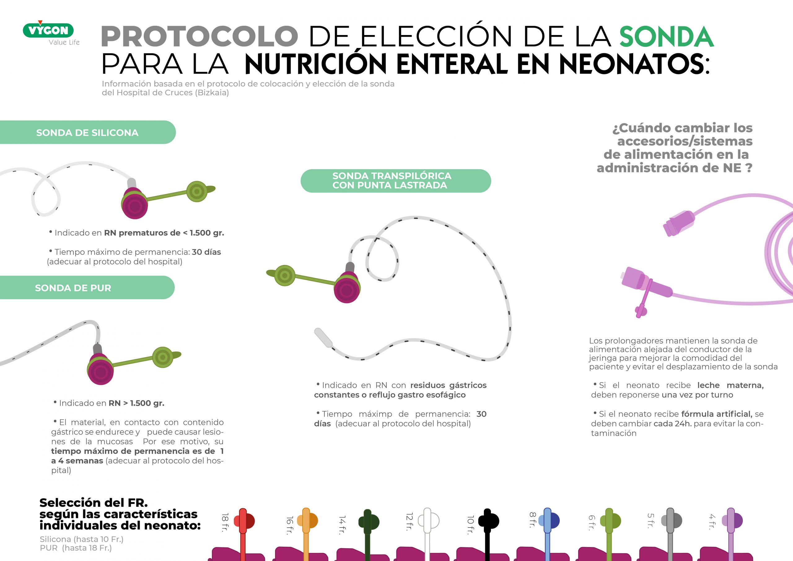 - Sondas en silicona: se empelan para nutriciones enterales de larga duración, generalmente, en recién nacidos de menos de 1.500 gr de peso. Debido al material son flexibles y ligeras y no reacciona en contacto con las secreciones gástricas.