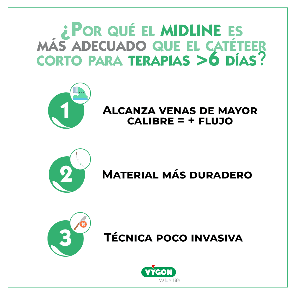 Un catéter midline dura hasta 4 semanas cuando un catéter corto dura entre 3 y 7 días. También otra ventaja es que produce menos flebitis mecánica a la hora de la inserción.