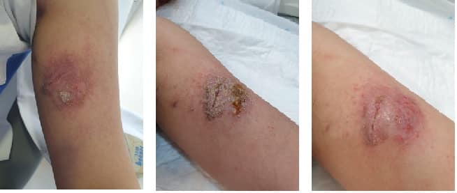 Foto izq.: dermatitis alérgica por apósito mantenido una semana en sede. Fuente: Gloria Ortiz Miluy.     –   Foto med.: dermatitis alérgica tras 4 días de mantener la zona al aire. Fuente: Gloria Ortiz Miluy.     –    Foto der.: dermatitis alérgica tras limpieza local. Se aprecian las zonas más afectadas con evidente exantema en las áreas donde se ha fijado el adhesivo del apósito. Fuente: Gloria Ortiz Miluy.
