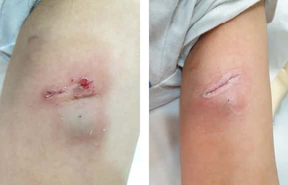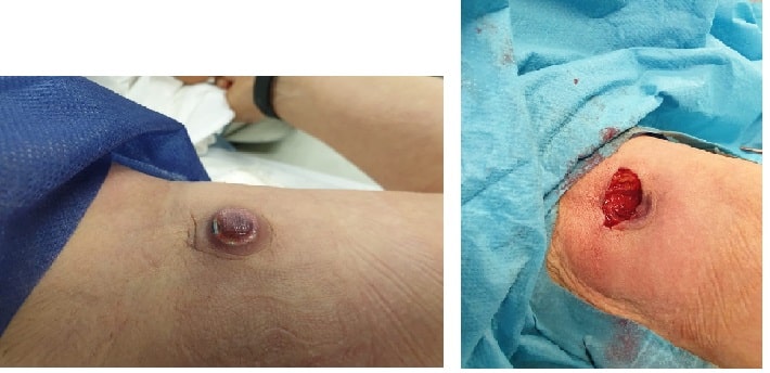 Foto izq.: Extrusión de cámara de PICC port en paciente oncológica con pérdida importante de masa corporal. Fuente: Gloria Ortiz Miluy.  –  Foto der.: retirada y reparación de la piel en caso de extrusión de la cámara de PICC-port. Fuente: Gloria Ortiz Miluy.
