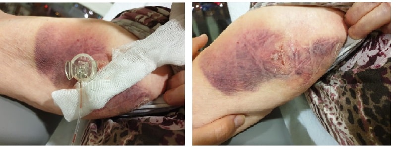 Foto izq.: equimosis local, indolora, tras 24h de inserción de PICC-port con aguja de Huber. Fuente: Gloria Ortiz Miluy.      –      Foto der.: equimosis local, indolora, en PICC-port sin aguja de Huber tras 24h de inserción del catéter. Fuente: Gloria Ortiz Miluy.