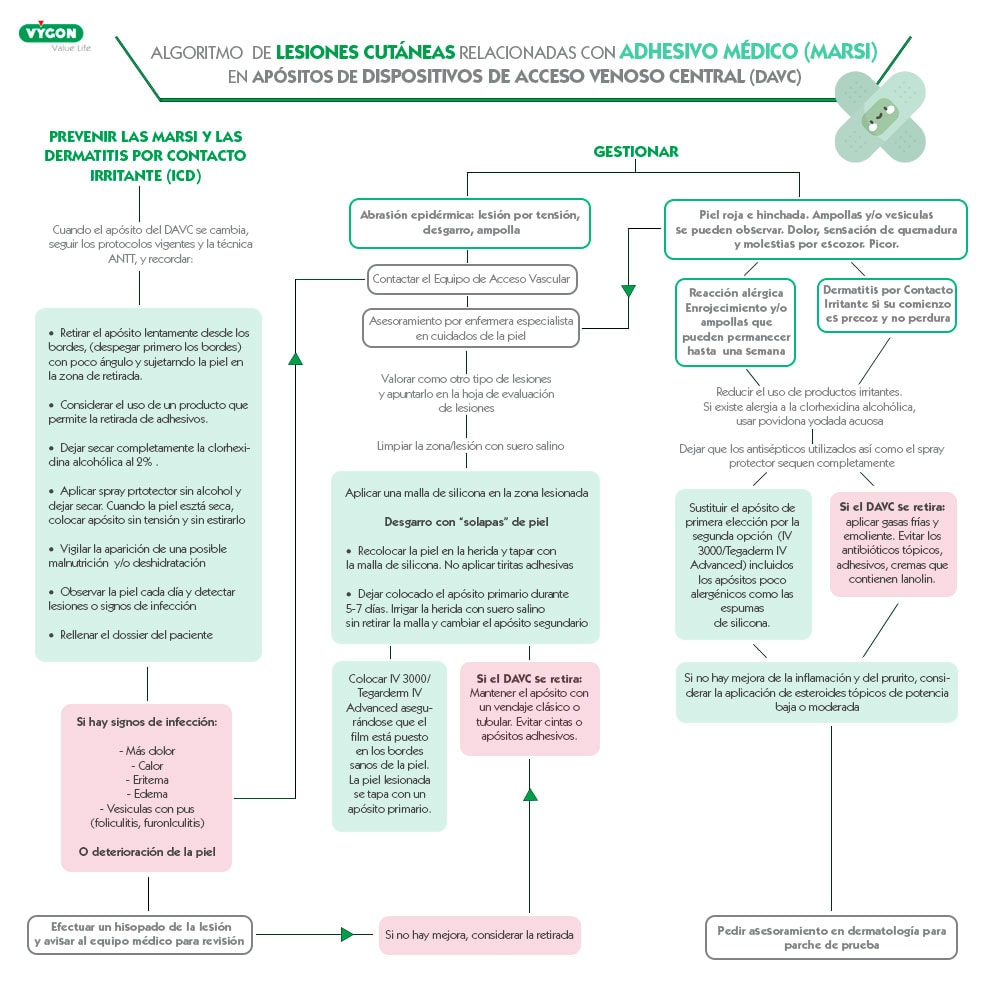 En caso de dermatitis, ésta puede comprometer el acceso a la cámara del reservorio a través de la punción de la misma. Por eso, es importante mantener una vigilancia de la zona de punción en los días posteriores a la inserción y en caso de que el paciente lleve a domicilio un infusor que debe fijarse con apósitos a la piel.