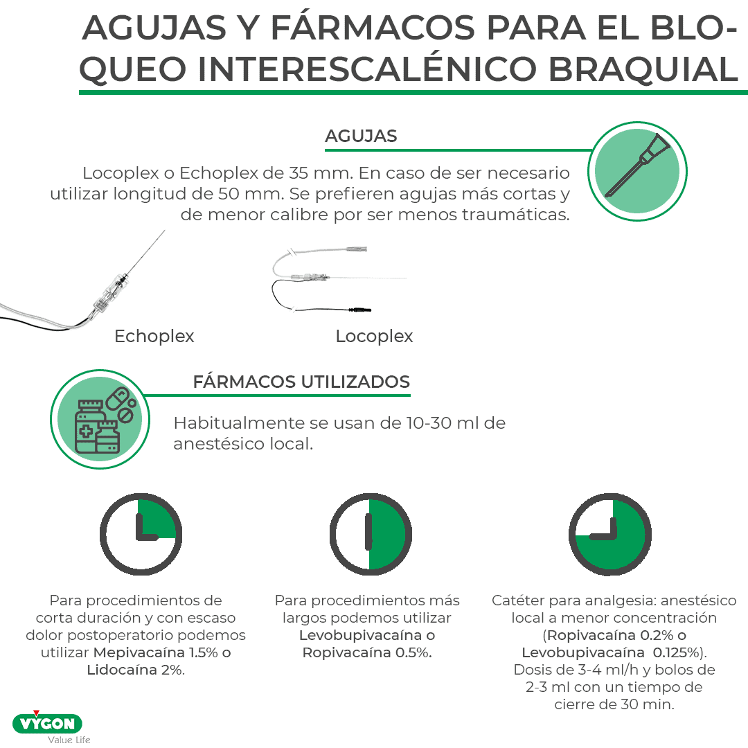 - Agujas: Locoplex o Echoplex de 35 mm. En caso de ser necesario utilizar longitud de 50 mm. Se prefieren agujas más cortas y de menor calibre por ser menos traumáticas.