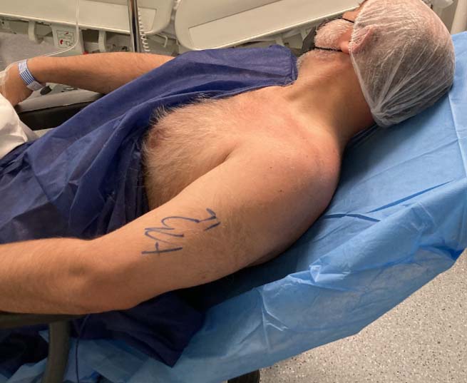 - La posición del anestesiólogo es por detrás del paciente en el lado a bloquear, con el ecógrafo en el lado contralateral. Se agarra la sonda con la mano no dominante y la aguja con la mano dominante. (Fig.4)