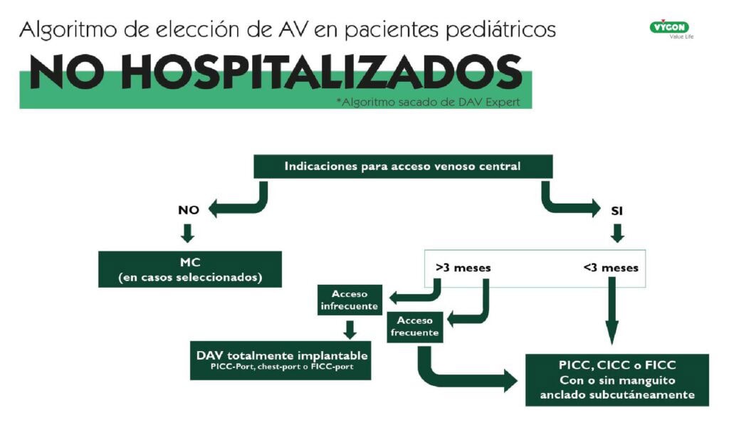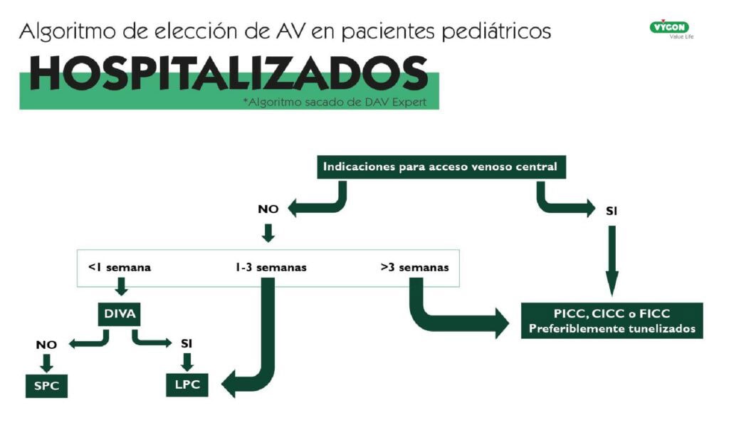 Para poder realizar una adecuada elección del DAV en este tipo de pacientes, es necesaria la aplicación de algoritmos como el DAV expert de GAVeCeLT o el miniMAGIC: The Michigan Appropriateness Guide for Intravenous Catheters in Paediatrics. En este caso nos centraremos en el DAV Expert fijándonos en el estudio “The pediatric DAV-expert algorithm: A GAVeCeLT/GAVPed consensus for the choise of the most appropriate venous Access device in children”. Este algoritmo nos hará centrar el foco en la necesidad de si el acceso vascular debe ser central o periférico y a partir de ahí desarrollar la elección según necesidades específicas.