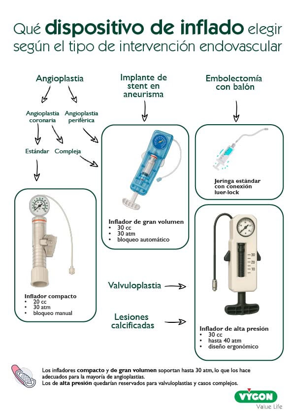La elección del dispositivo de inflado depende del tipo de intervención, tamaño del balón y preferencia del operador.