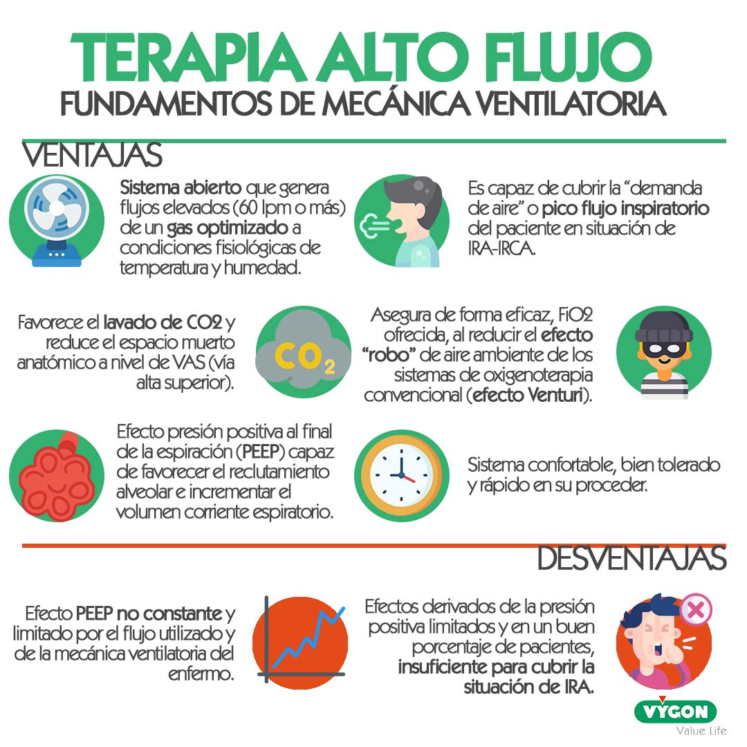 Esta terapia garantiza una FiO2 continua entre el 21-100% de un gas optimizado desde el punto de vista de humedad y acondicionado a temperatura corporal, al que se añade un efecto beneficioso de presión positiva al final de la espiración, lo que va a favorecer que sea una terapia muy bien tolerada.