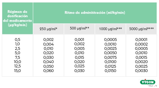 Es importante que esta dilución no supere una concentración de 5 mg/ml (5000 µg/ml). Teniendo en cuenta que la mayoría de los pacientes responden favorablemente a dosis de 2,5 a 10,0 µg/kg/min.