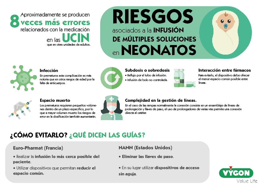 - Infección. Uno de los riesgos más importantes que encontramos asociados al dispositivo es la infección. Particularmente en prematuros esta complicación es más notoria que en otros rangos de edad por la falta de anticuerpos. Por ello, es importante seleccionar el dispositivo de administración teniendo en cuenta esta complicación. Las rampas o llaves de tres pasos no permiten una desinfección adecuada, además precisan una mayor manipulación, aumentando las posibilidades de desconexiones accidentales que pueden dejar el sistema abierto.